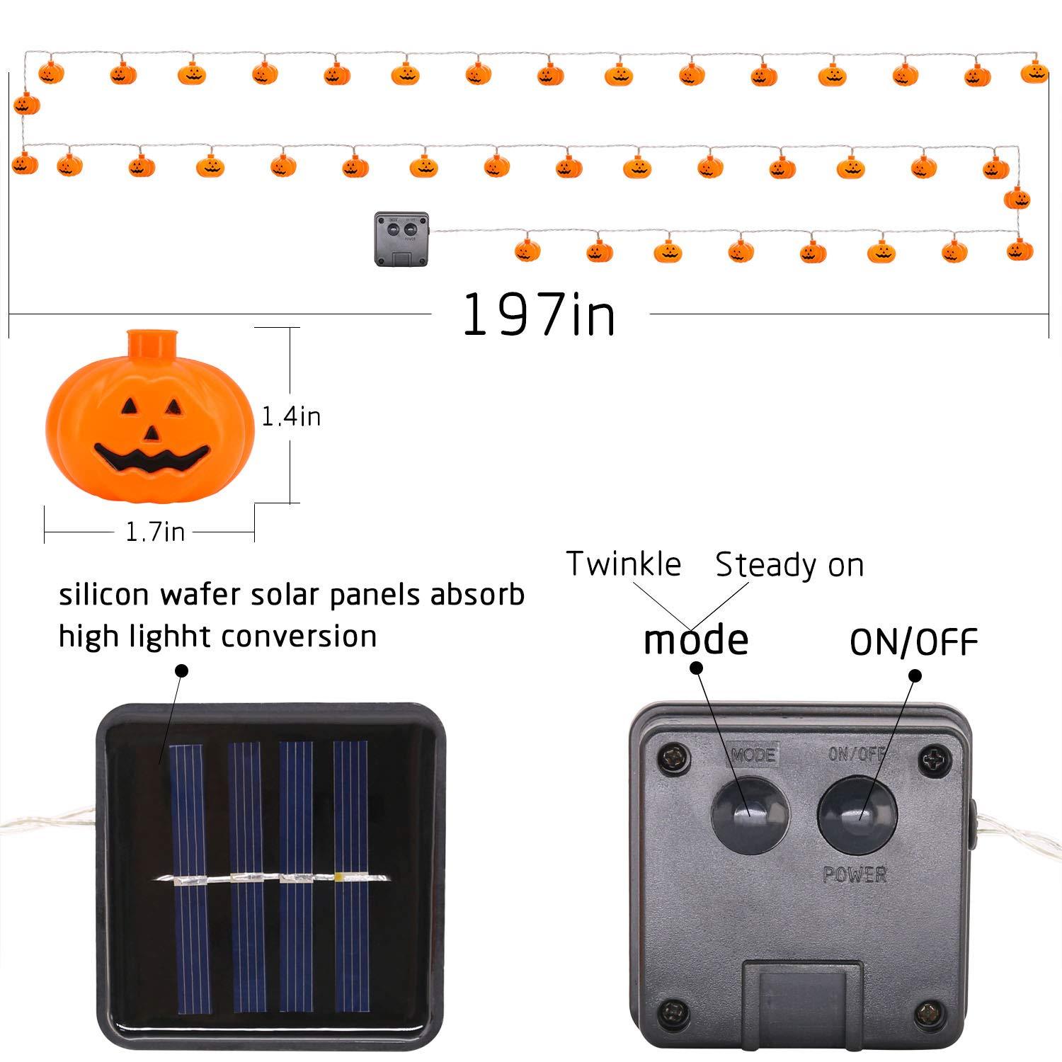 Easily set up and hang, safe and never over heat. Best outdoor decoration for Halloween. Hang and set up the solar panel in an optimal position, battery not required, so you can light them up anytime you want with low consumption of energy. Last approximately 8 hours when fully charged. Each set has 40 small LED Jack O Lanterns. It will create a magical atmosphere for your house. Different from traditional string lights, our copper string lights are more durable and water proof. Two lighting modes available, regular and blink.